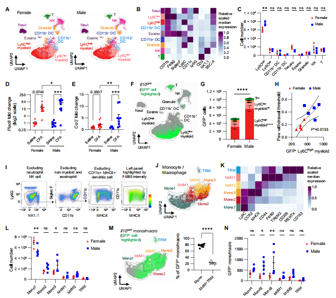图1. 雄性小鼠体内 IL10⁺单核细胞数量显著多于雌性小鼠。(A、B)CFA处理后皮肤免疫细胞的UMAP图及表面标志物相对表达热图,簇颜色与细胞类型对应。(C)CFA处理后皮肤免疫细胞数量。(D、E)WT小鼠CFA处理7天后皮肤中Plac8和Ccr2的mRNA水平。(F)UMAP图中浅绿色示皮肤免疫细胞群中的Il10-GFP细胞。(G)雌雄小鼠Il10-GFP⁺细胞数量。(H)CFA处理6天后,皮肤Il10-GFP⁺Ly6Chigh髓系细胞数量与机械痛阈值的相关性,R²=0.55,Pearson r=0.7444(雌性:红色三角;雄性:蓝色方块)。(I)单核细胞/巨噬细胞选择性圈门策略。(J)UMAP图展示3个单核细胞亚群、2个MdM亚群及1个TRM亚群。(K)热图示表面标志物相对表达,单核细胞亚群高表达Ly6C和CCR2。(L)各亚群在雌雄小鼠炎症皮肤中的分布。(M)左图UMAP浅绿色示Il10-GFP⁺单核细胞/巨噬细胞分布;右图为其单核细胞/巨噬细胞占比。(N)Il10-GFP⁺单核细胞/巨噬细胞定量。