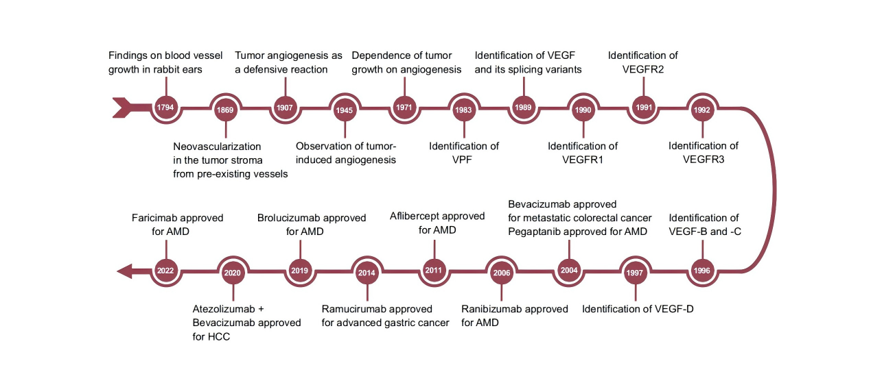 1993年,Kim发现中和抗VEGF抗体可以显著降低植入免疫缺陷小鼠的血管生成和肿瘤细胞的生长,首次证实靶向VEGF的治疗潜力,开辟了新的治疗机会。1996年,Carmeliet 等证明了小鼠VEGF基因的单个等位基因失活导致血管发育缺陷和早期胚胎死亡,强调了VEGF在胚胎发育中的重要性[4]。2004年贝伐珠单获FDA批准用于转移性结直肠癌,成为首个获批的VEGF靶向药物。随后贝伐珠单抗及其他VEGF抑制剂(如阿柏西普、雷珠单抗)陆续获批用于非小细胞肺癌、肾癌、胶质母细胞瘤等多种癌症以及湿性年龄相关性黄斑变性(AMD)和糖尿病视网膜病变(DR)等疾病的治疗。2018年 贝伐珠单抗联合PD-L1抑制剂(Atezolizumab)获批用于非鳞状非小细胞肺癌,标志VEGF与免疫治疗的协同应用进入临床[5]。