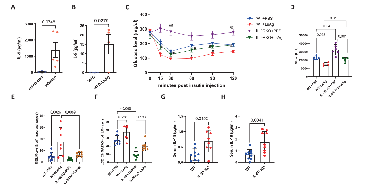 研究者发现在非洲队列,感染丝虫的人IL-9更高。因此把丝虫抗原(LsAg)打进肥胖小鼠体内,感染30天后,野生型小鼠胰岛素耐量改善,胸腔内IL-9升高3倍,而IL-9R缺失小鼠的保护效应却打对折(图6)。这提示了蠕虫来源的免疫调节分子可间接“添柴”给IL-9通路,为未来“仿虫抗炎代谢药物”的开发提供了新思路。