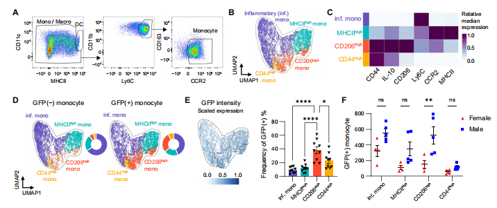 图2. 与雌性小鼠相比,雄性小鼠炎症皮肤中IL-10⁺ CD206high单核细胞更为普遍。(A)CFA处理后皮肤中,从其他CD45⁺细胞中鉴定单核细胞的流式细胞术圈门策略;MHCII/CD11c流式图与图2I一致。(B、C)CFA处理后皮肤单核细胞亚群的代表性UMAP图,由8只小鼠的20000个单核细胞随机筛选汇集生成;根据标志物表达,单核细胞被分为“炎症型”、MHCII型、CD206型和CD44型四个簇。(D)各簇在Il10-GFP⁺和Il10-GFP⁻单核细胞中的分布情况。(E)每个簇中Il10-GFP⁺单核细胞的频率。(F)每种性别各簇中Il10-GFP⁺单核细胞的定量统计。