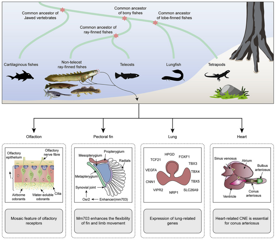 肉鳍鱼这一支登上陆地后,把早期的气囊演化成了后来的肺[2]。而留在水里的硬骨鱼发展出辐鳍鱼以后,最终把气囊演化成了特化的鱼鳔,专一提供浮力的调节。