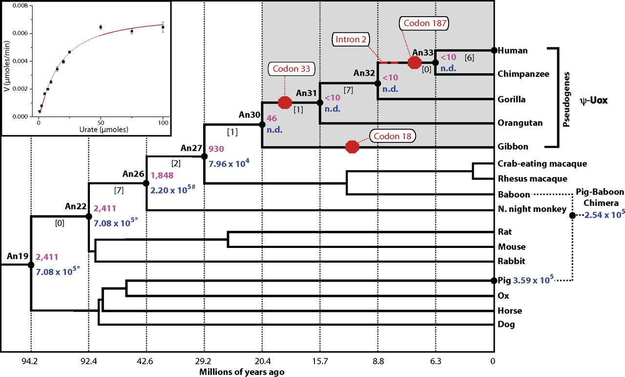我们祖先的尿酸酶(uricase)基因发生了多个点突变(已鉴定3种)和插入/缺失事件,使其成为伪基因,失去了编码蛋白质的功能[5] [6]。