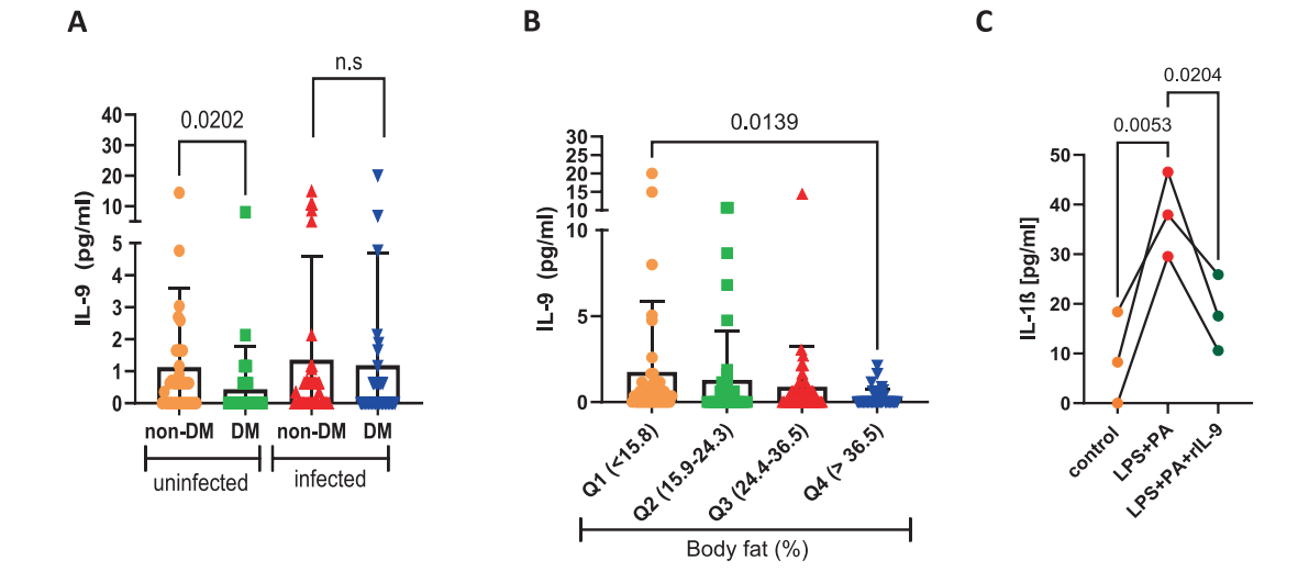 研究者对喀麦隆159名成年人进行分层研究发现:未感染蠕虫的糖尿病患者血清IL-9显著降低,体脂每升高一个四分位,IL-9下降约15%(图1),另外IL-9与CRP、体脂负相关,与肌肉量、胰岛素正相关。