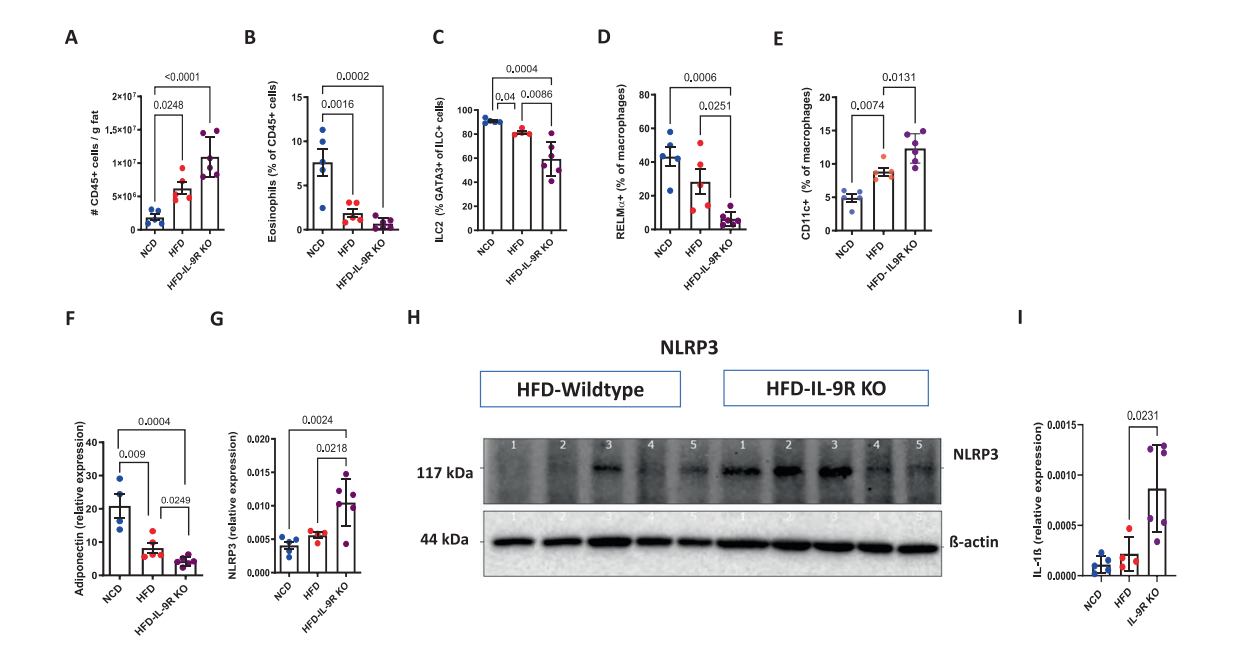 【图3】 IL-9R缺失在饮食诱导的肥胖过程中导致炎症特征加剧。A.每克脂肪组织中总免疫细胞数量;B.嗜酸性粒细胞;C.2型固有淋巴样细胞(ILC2)、D.RELMα⁺巨噬细胞;E.CD11c⁺巨噬细胞的频率;脂肪组织中;F.脂联素;G.NLRP3的基因表达;高脂饮食(HFD)喂养12周后野生型与IL-9R敲除(KO)小鼠脂肪组织中H NLRP3的蛋白表达;I.IL-1β的基因表达。