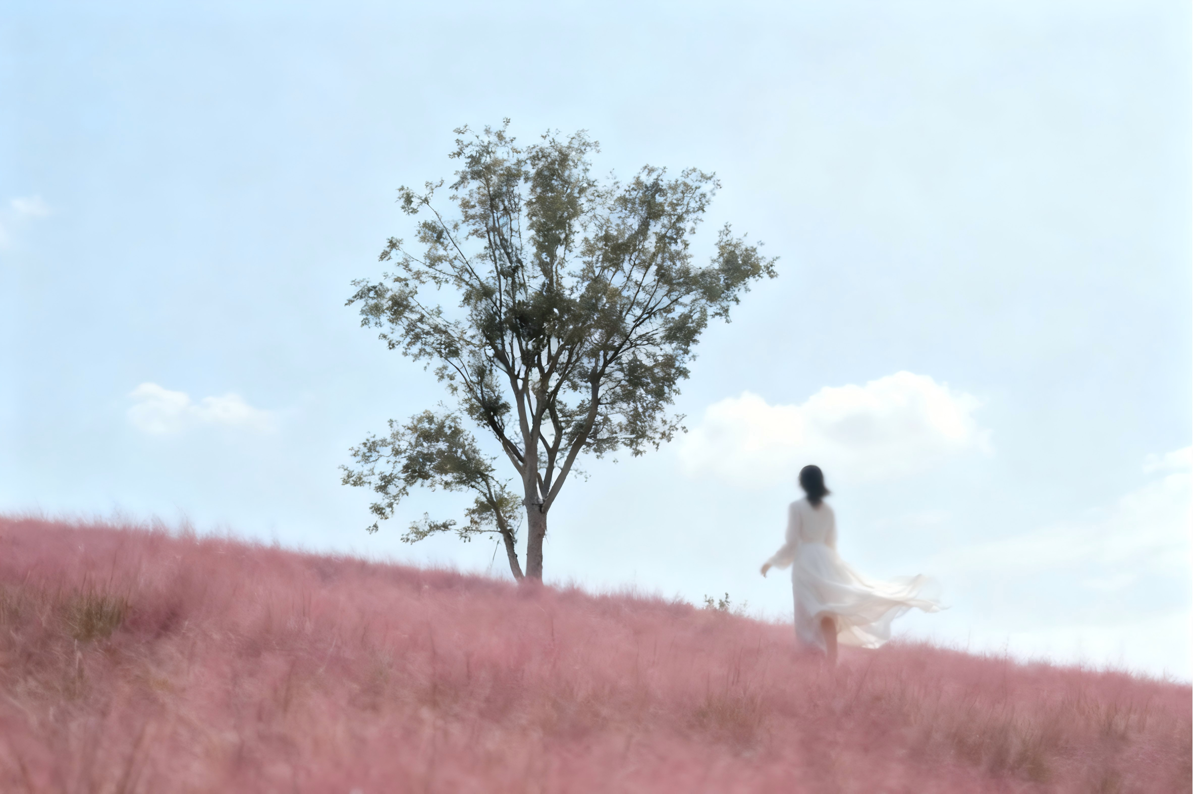 穿搭建议:浅色系衣物是粉黛花海的最佳拍档,长裙随风飘动,照片更显灵动。