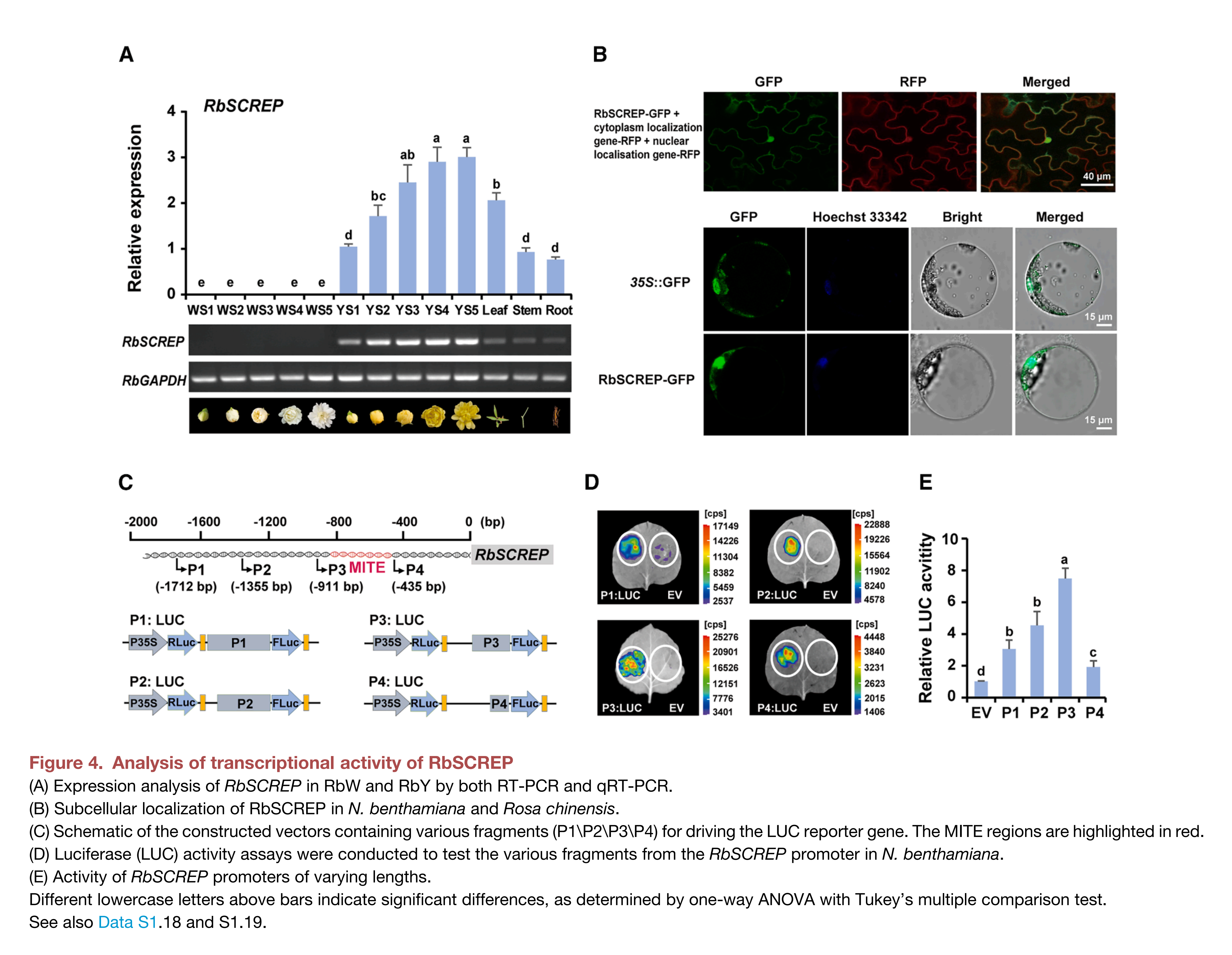图4|RbSCREP蛋白的亚细胞定位、转录激活活性及MITE插入对启动子活性的增强效应。来源:原PDF Figure 4,第7页。