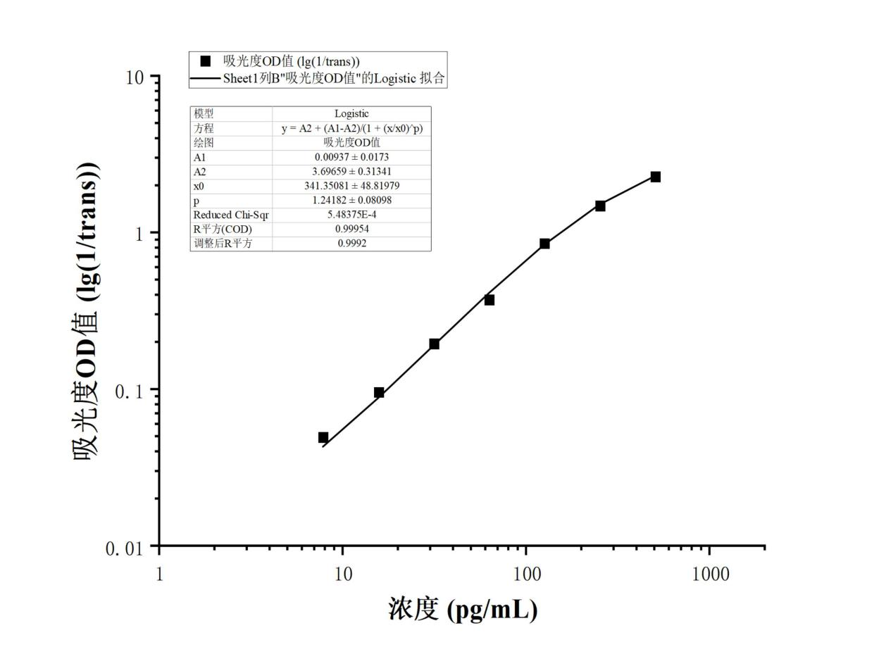 以标准品溶液考察试剂盒的OD值范围和相关系数。以四参数逻辑函数模型拟合标准曲线时,在试剂盒规定的标准浓度范围内,标准曲线的相关系数(R2)应≥0.99。