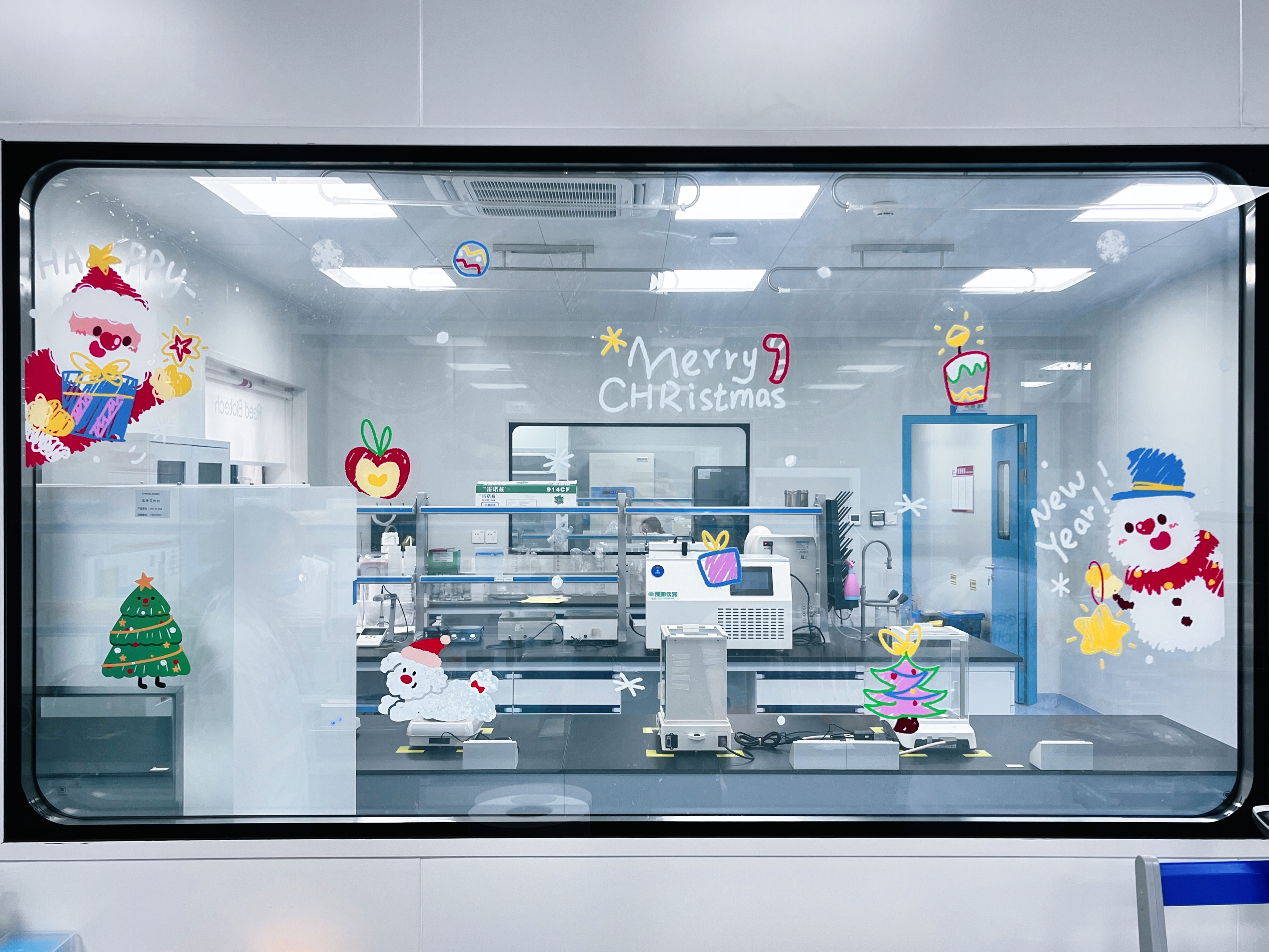 实验室玻璃上,贴了片圣诞氛围贴纸