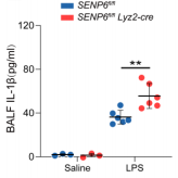 腹腔注射LPS 12h后,SENP6fl/fl和SENP6fl/fl Lyz2-cre小鼠支气管肺泡灌洗液中IL-1β水平。