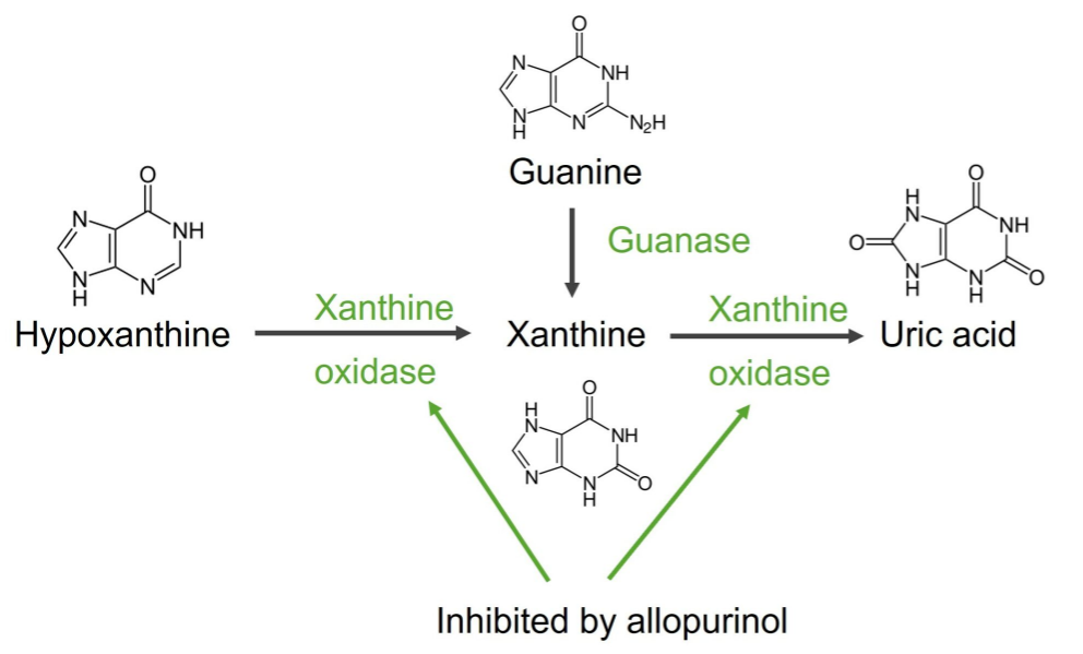 因此在生物体内,嘌呤都必须先代谢为尿酸(uric acid)。