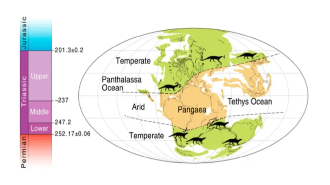 随着三叠纪开启,因为植被的缺少,整个地球都表现出干燥、炎热、低氧的状态,甚至赤道附近一度缺少生命踪迹,被称为“死亡带”[4]。