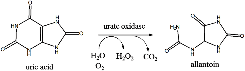 尿酸被代谢为尿囊素(allantoin)后,易溶于水,不仅容易直接排出体外,也可以进一步代谢成尿素或氨气排出体外[1]。