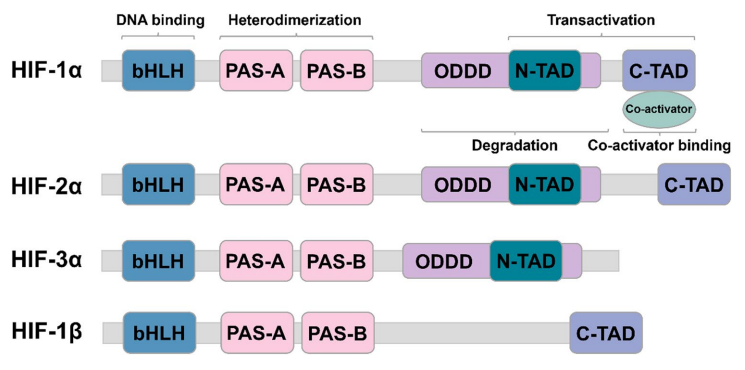 HIF 家族共有 3 个亚型,HIF-1, HIF-2和HIF-3,其中 HIF-1α、HIF-2α 主导肿瘤进程。他们共同结构域是决定其功能的关键,包括: